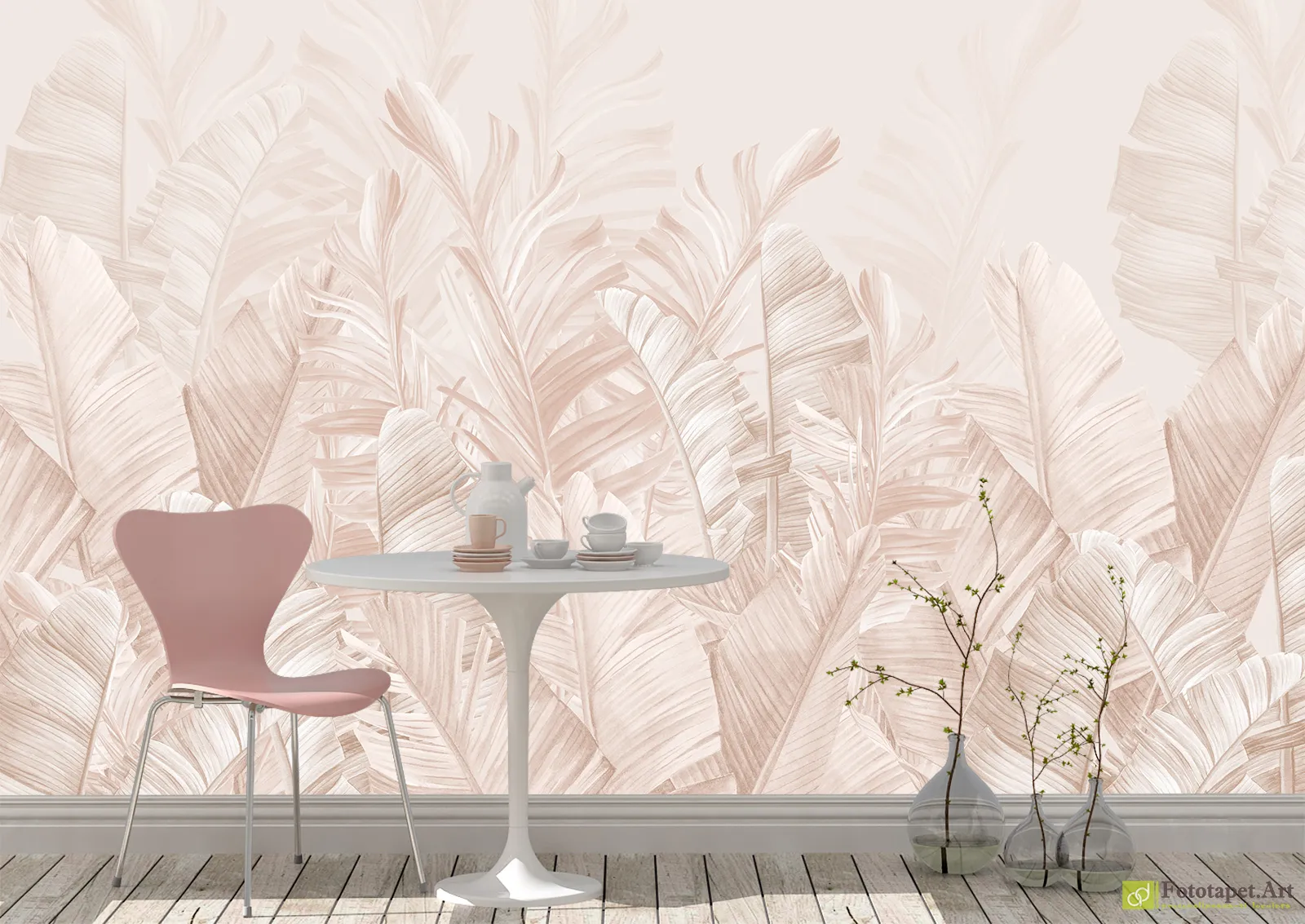 Fototapet living, Frunze tropicale în stil acuarelă. Optează pentru tapet vinil pentru perete dormitor, rezistent și ușor de întreținut.
