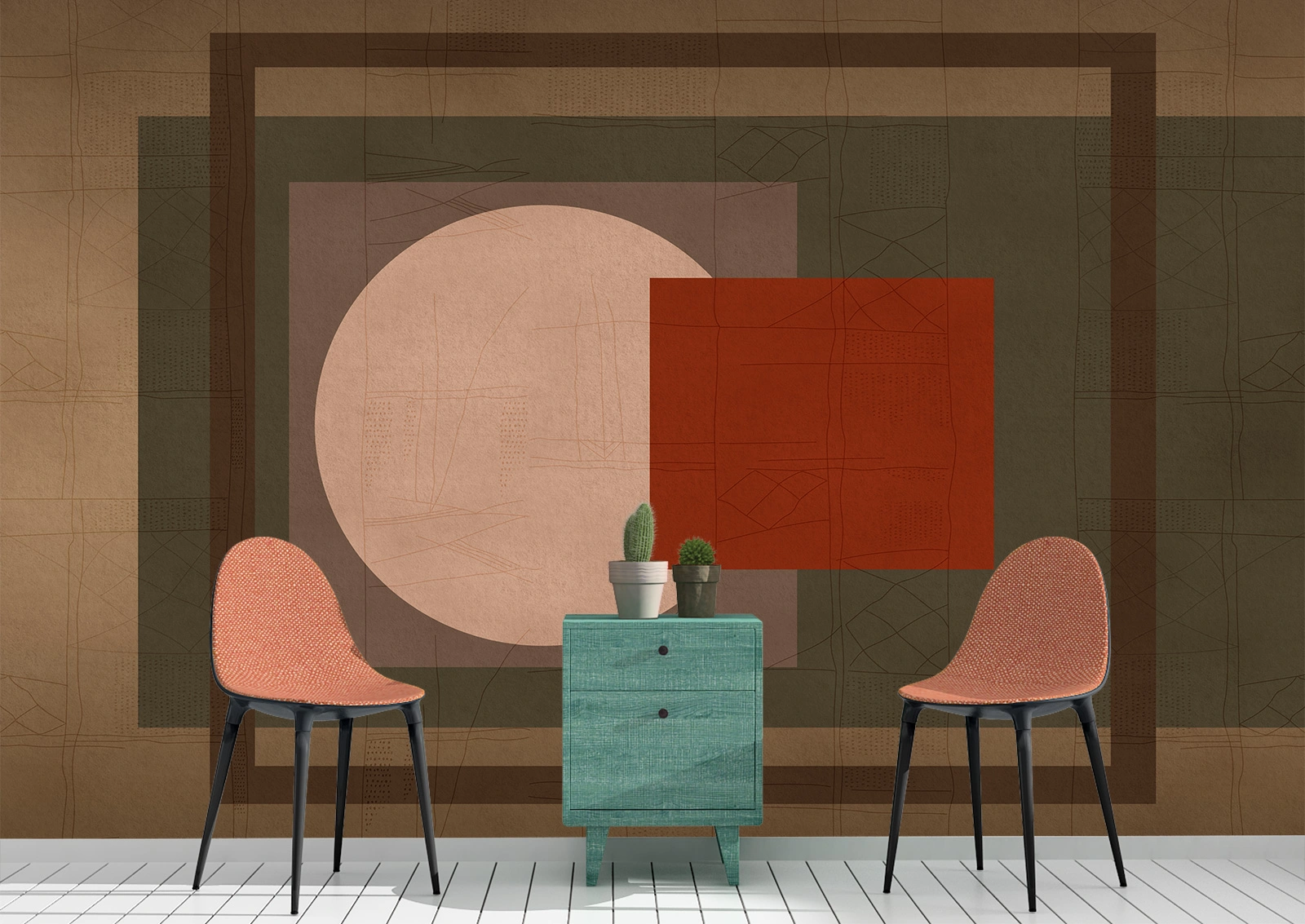 Design Geometric Modern, Fototapet Abstractiv pentru living sau dormitor. Cele mai bune prețuri pentru fototapet. Materiale ecologice. Livrare rapidă în România.Adaugă un strop de eleganță și sofisticare în camera ta cu acest fototapet cu design geometric abstract. Tonurile calde de maro, verde și roșu cărămiziu, combinate cu forme clare și linii fine, creează un decor contemporan și armonios. Ideal pentru un birou sau un colț de relaxare modern.