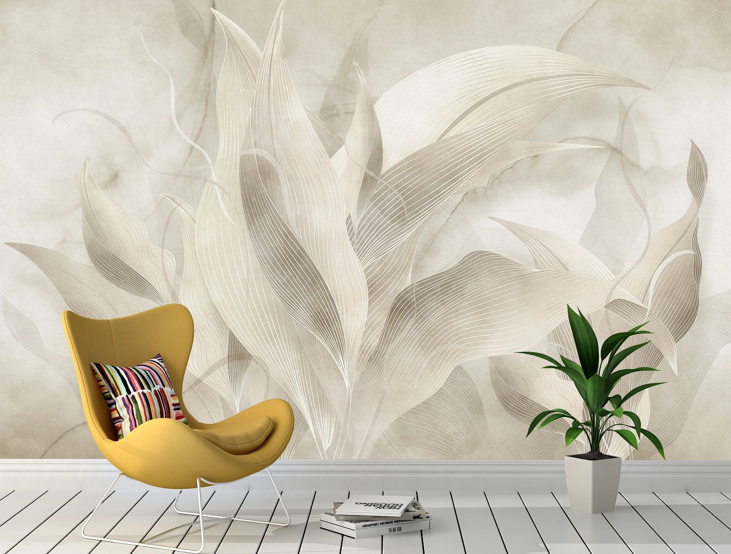 Creează un ambient relaxant și elegant cu acest fototapet ce prezintă frunze fine în nuanțe de alb și bej. Liniile subtile și fundalul delicat adaugă un aer modern și rafinat oricărui spațiu. Ideal pentru a adăuga un strop de naturalețe și calm în orice cameră de zi sau dormitor.
