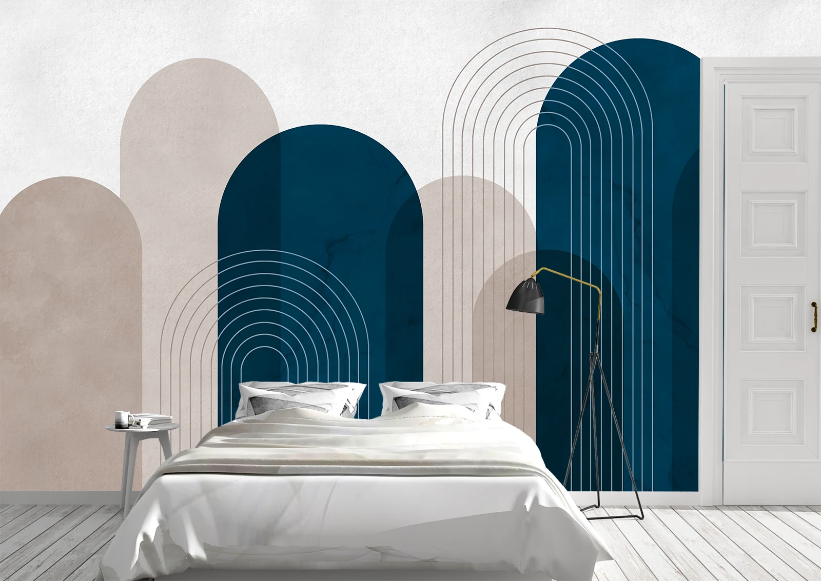 Adaugă un accent sofisticat dormitorului tău cu acest fototapet geometric în nuanțe profunde de albastru și bej cald. Designul modern cu arcuri și linii fine creează un efect tridimensional subtil, ideal pentru interioare minimaliste și elegante. Perfect pentru cei care apreciază simplitatea cu stil, acest fototapet transformă orice spațiu într-un colț de design contemporan.