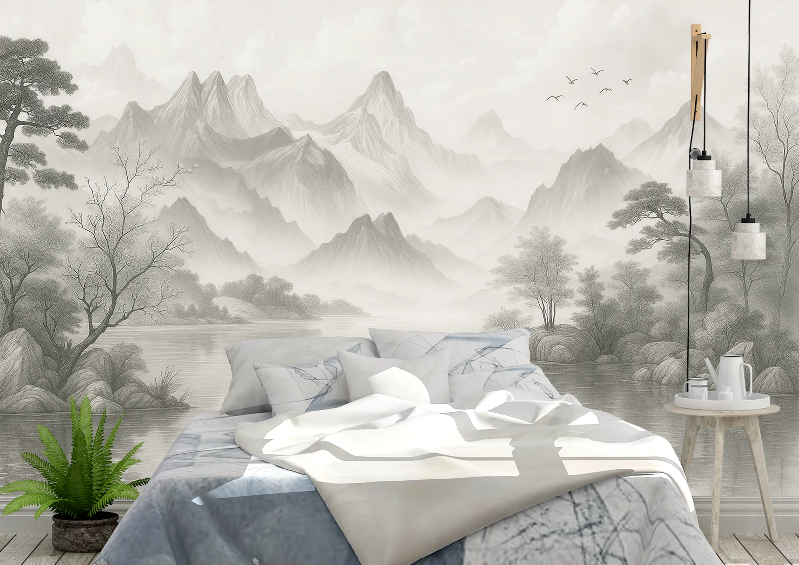 Transformă-ți dormitorul într-un refugiu de liniște cu acest fototapet artistic, inspirat de peisajele montane asiatice. Redat în nuanțe subtile de gri și alb, designul evocă serenitate și echilibru, fiind ideal pentru spații de relaxare. Munții, copacii și lacul creează un tablou monocrom ce îmbină arta și natura într-o atmosferă zen.