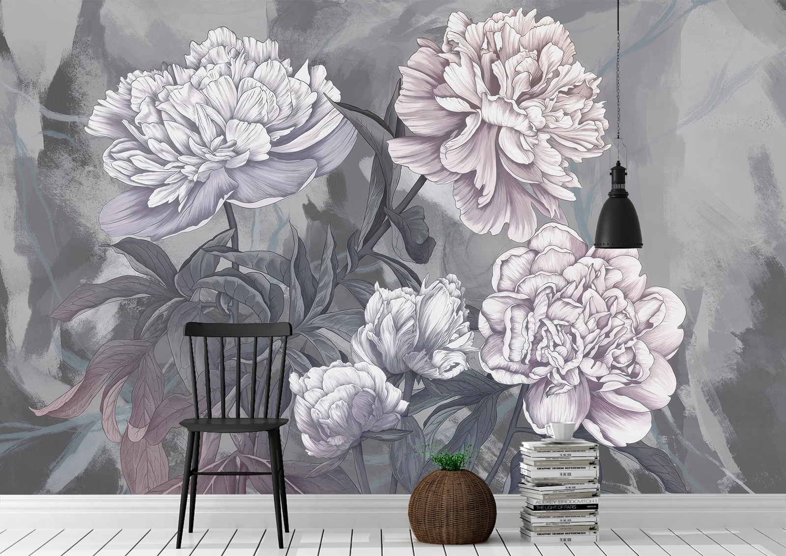 Un fototapet spectaculos ce îmbină grația bujorilor ilustrați artistic cu un fundal gri expresiv, stilizat în tonuri picturale. Petalele mari, în nuanțe de lila, roz pal și alb, adaugă dramatism și rafinament oricărui interior. Este ideal pentru un living sofisticat, un dormitor elegant sau un spațiu creativ cu personalitate. Acest design floral contemporan oferă profunzime și un impact vizual memorabil în orice cameră.