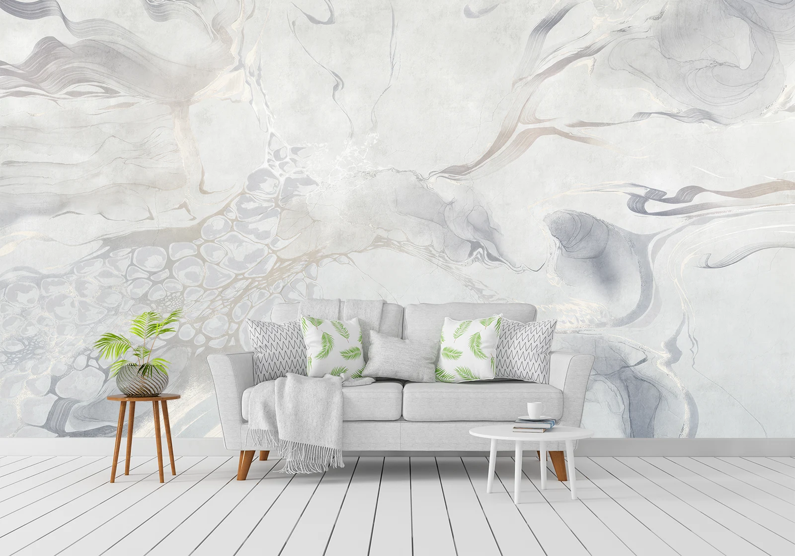 Acest fototapet cu design abstract inspirat de textura marmurei aduce rafinament și armonie în orice spațiu. Nuanțele delicate de alb, gri și bej creează o atmosferă luminoasă și aerisită, ideală pentru interioare minimaliste sau nordice. Liniile fluide și detaliile grafice oferă un efect vizual modern și sofisticat. Potrivit pentru livinguri, holuri elegante sau birouri amenajate cu bun gust, acest tapet transformă peretele într-un punct de atracție discret și stilat.