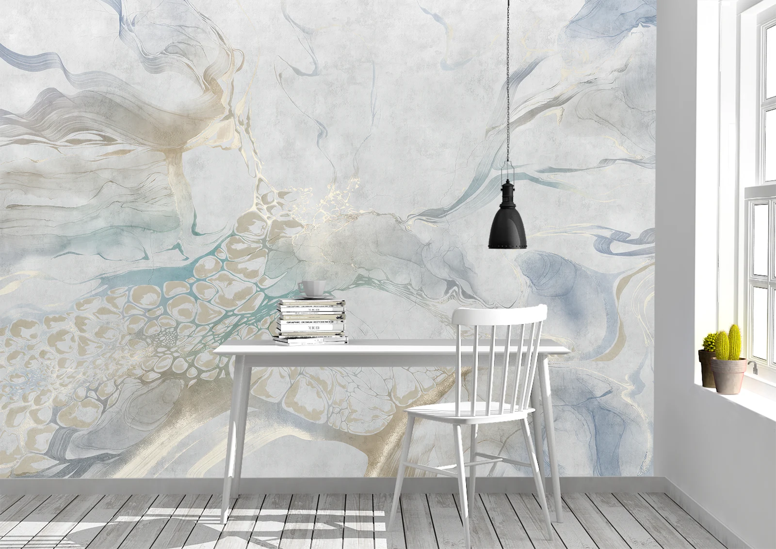 Un fototapet elegant și subtil, cu forme abstracte ce amintesc de mișcarea apei sau structura marmurei, în nuanțe delicate de albastru, bej și gri. Textura fină și liniile fluide conferă dinamism și liniște spațiului, fiind alegerea perfectă pentru birouri, camere de zi sau interioare cu design minimalist. Creează o atmosferă rafinată și luminoasă, fără a încărca vizual încăperea. Este o soluție ideală pentru cei care doresc un accent modern, dar discret.