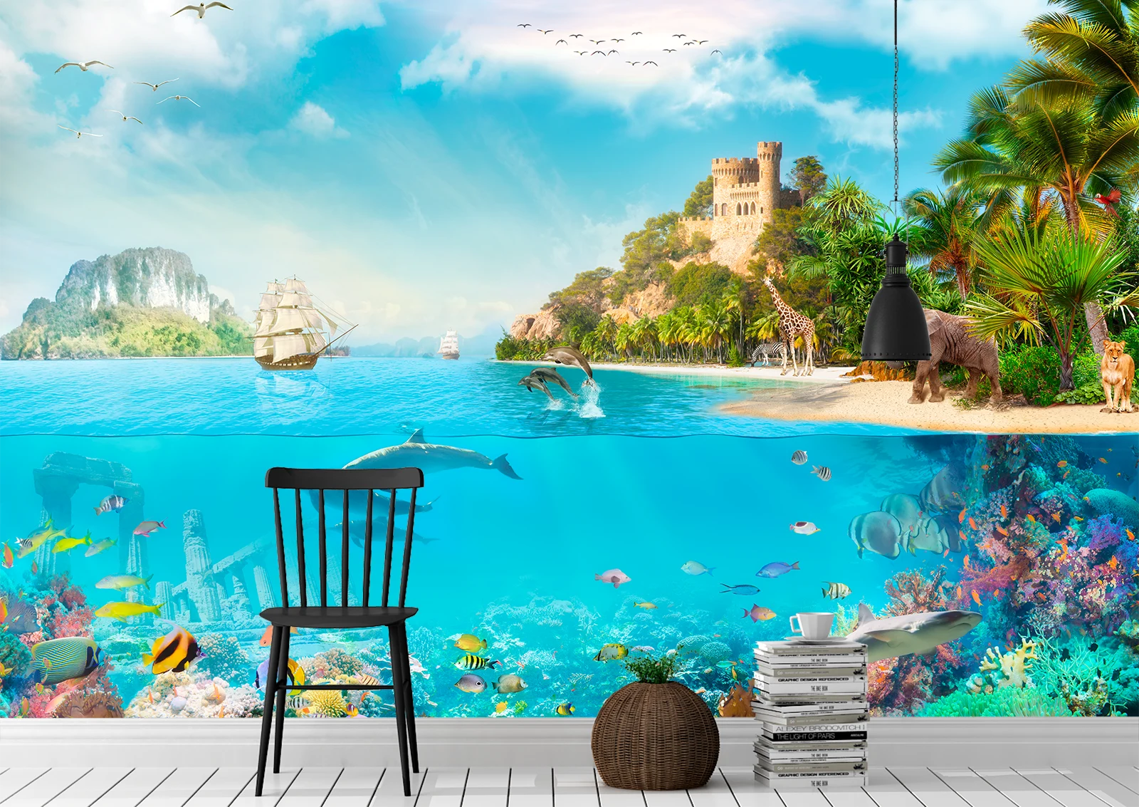 Acest fototapet aduce în casa ta un univers plin de culoare și imaginație. În partea superioară, peisajul surprinde o insulă tropicală cu palmieri, animale sălbatice precum girafe și elefanți, dar și un castel misterios și corăbii cu vele pe apele turcoaz. În partea inferioară, privirea pătrunde în adâncul mării, dezvăluind un recif de corali spectaculos, pești exotici multicolori și delfini jucăuși. Este ideal pentru un living modern, o cameră de copii sau un spațiu creativ, oferind energie, veselie și o notă de aventură exotică.