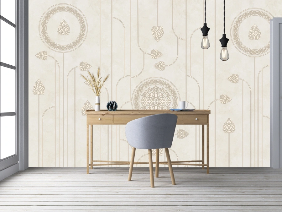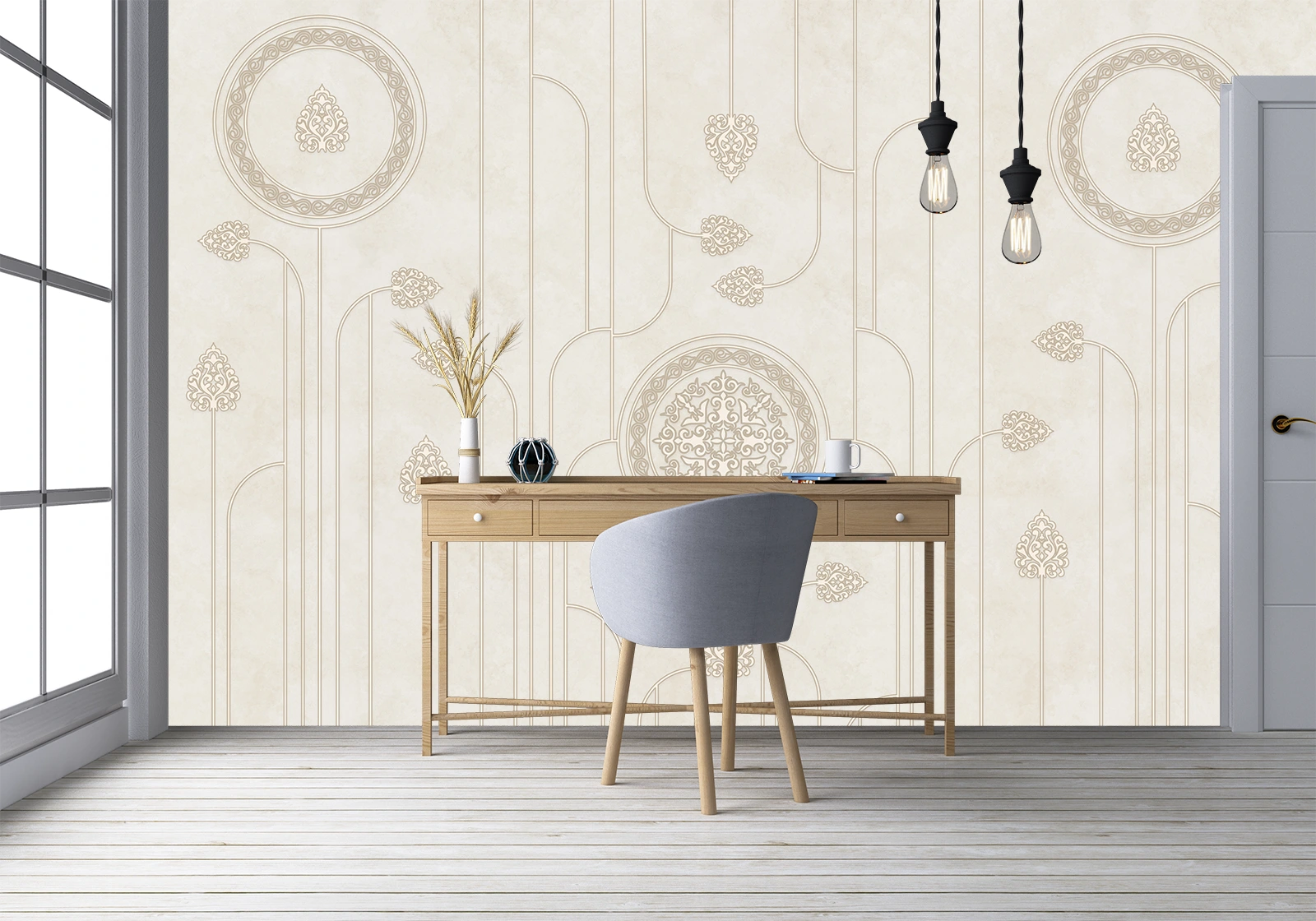 ✅ Fototapet cu modele orientale și detalii geometrice fine în crem. ✓ Eleganță și stil pentru birou sau living. 🚚 Livrare rapidă în România. ⭐ Art-Tapete.ro