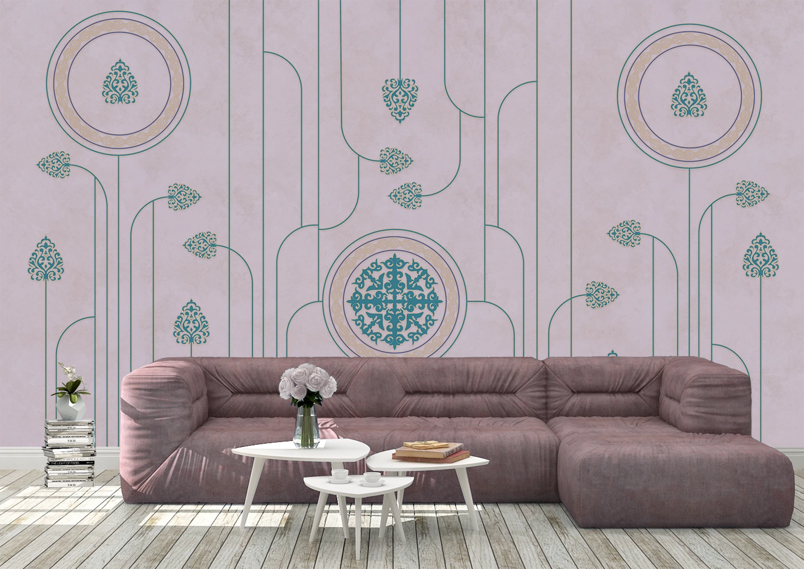 Acest fototapet rafinat reprezintă o alegere excelentă pentru cei care doresc să aducă o notă de eleganță și stil în locuința lor. El îmbină armonios nuanțele delicate de lila cu detalii captivante turcoaz, inspirate de motivele orientale, cunoscute pentru rafinamentul și complexitatea lor. Această combinație de culori nu doar că aduce un plus de culoare și dinamism încăperii, dar și contribuie la crearea unei atmosfere unice și relaxante.