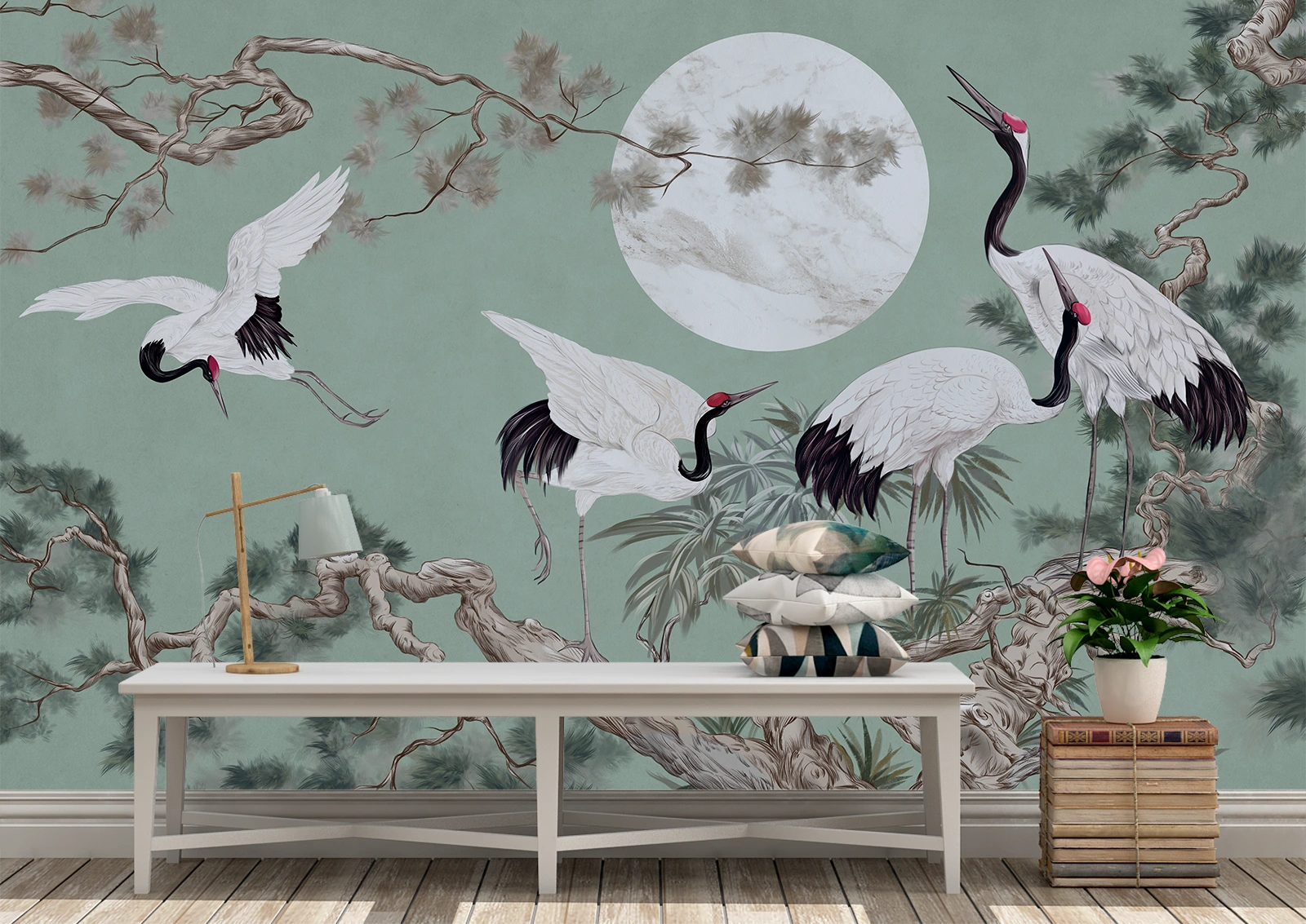 ✅ Fototapet artistic cu cocori sub lună plină pe fundal verde închis. ✓ Design oriental elegant pentru living sau dormitor. 🚚 Livrare rapidă în România.