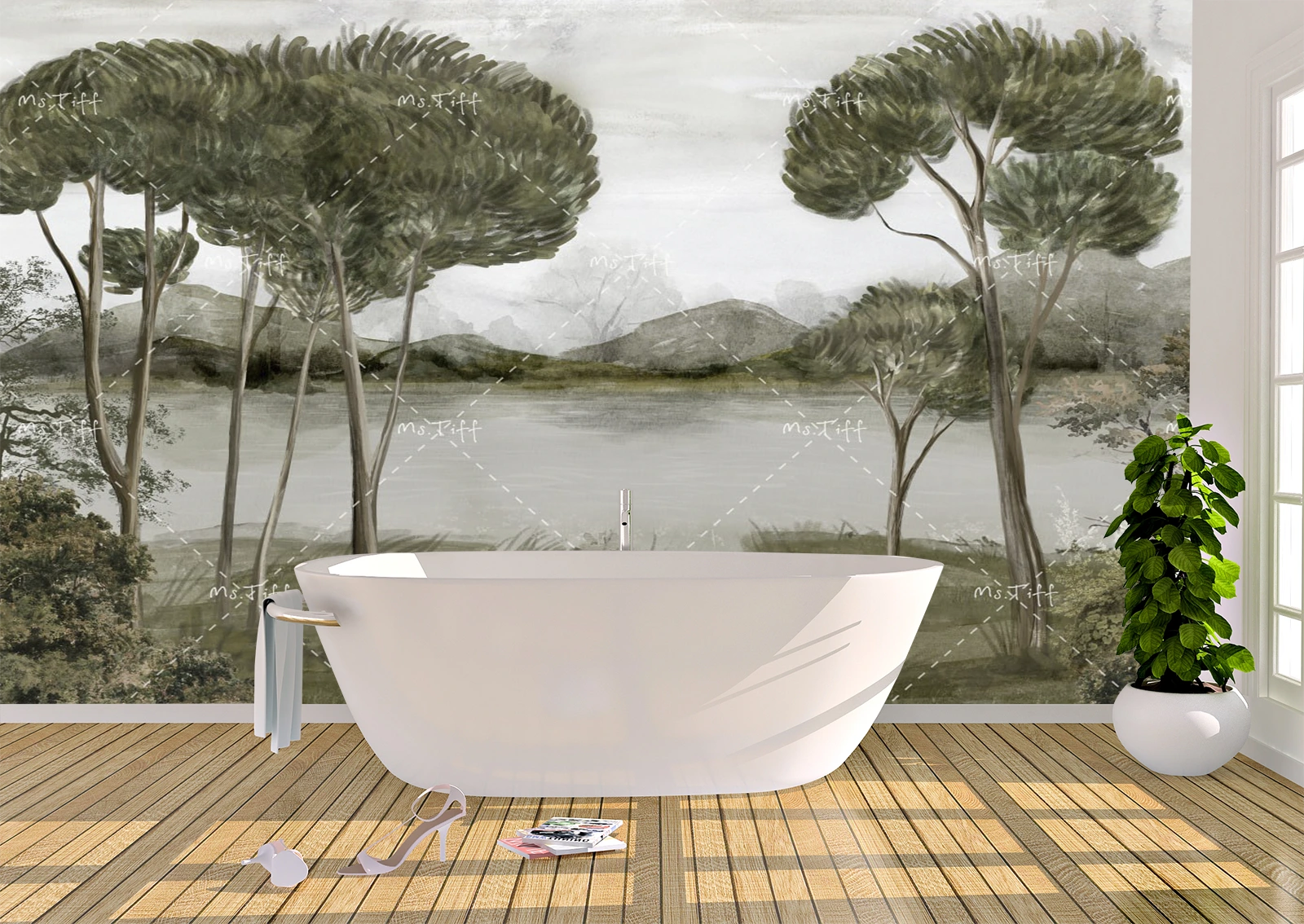 Acest fototapet cu pini și lac creează o atmosferă calmă și elegantă, transformând orice spațiu într-un refugiu natural. Tonurile neutre de verde și gri adaugă profunzime și echilibru, iar detaliile picturale conferă peretelui un efect artistic rafinat. Perfect pentru băi spa, dormitoare sau livinguri minimaliste, acest design Ms. Tiff aduce liniștea naturii direct în casa ta. 🌲💧