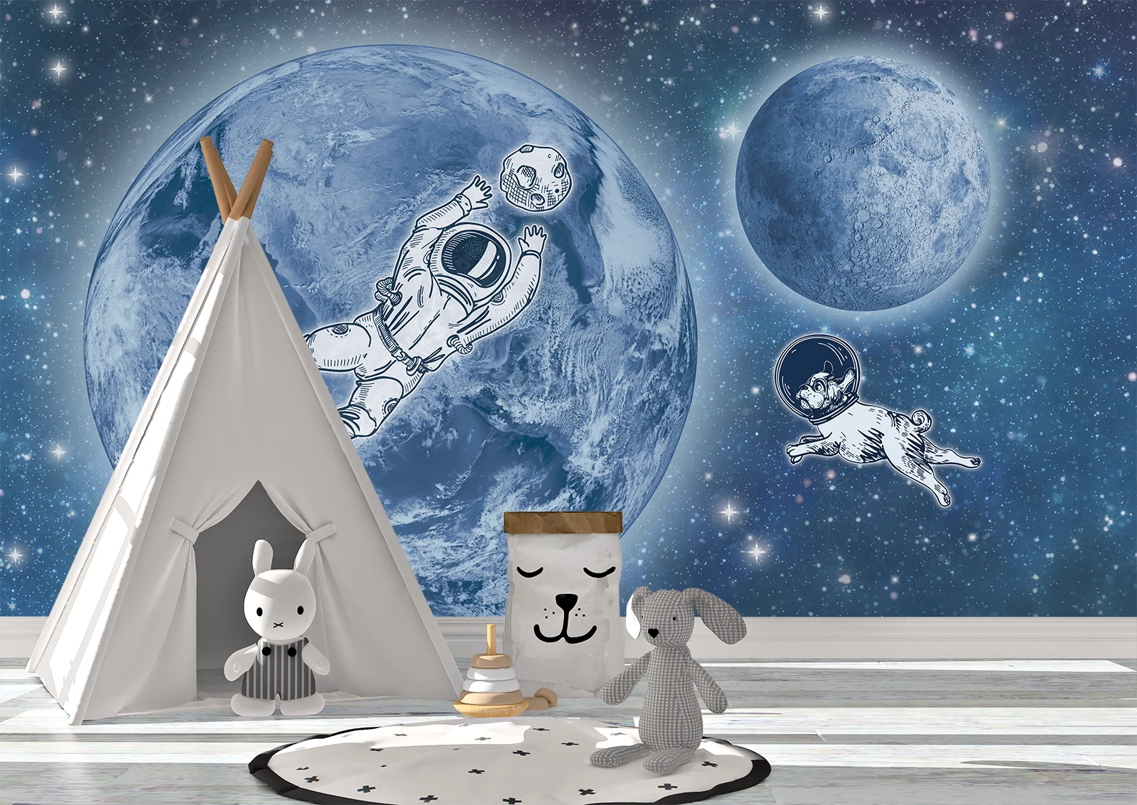 Acest fototapet spațial aduce magia universului direct în camera copilului, transformând peretele într-o scenă plină de imaginație și aventură. Planetele albastre de mari dimensiuni creează un fundal spectaculos, iar astronautul ilustrat într-un stil jucăuș adaugă dinamism și energie. Prezența simpaticului cățeluș în costum de astronauț oferă un plus de veselie și originalitate, făcând decorul ideal pentru copiii care iubesc explorarea și poveștile fantastice.