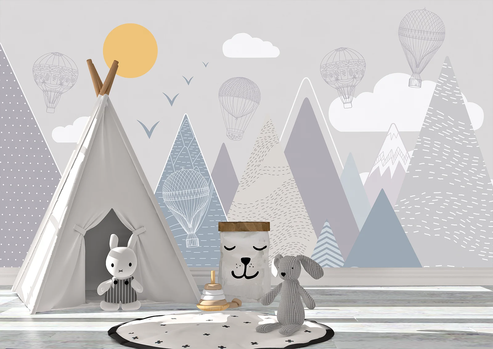✅ Decor cu munți și baloane pentru camera celor mici. ✓ Creează o atmosferă calmă și modernă în spațiul copilului. 🚚 Livrare rapidă în România. ⭐ Art-Tapete.ro