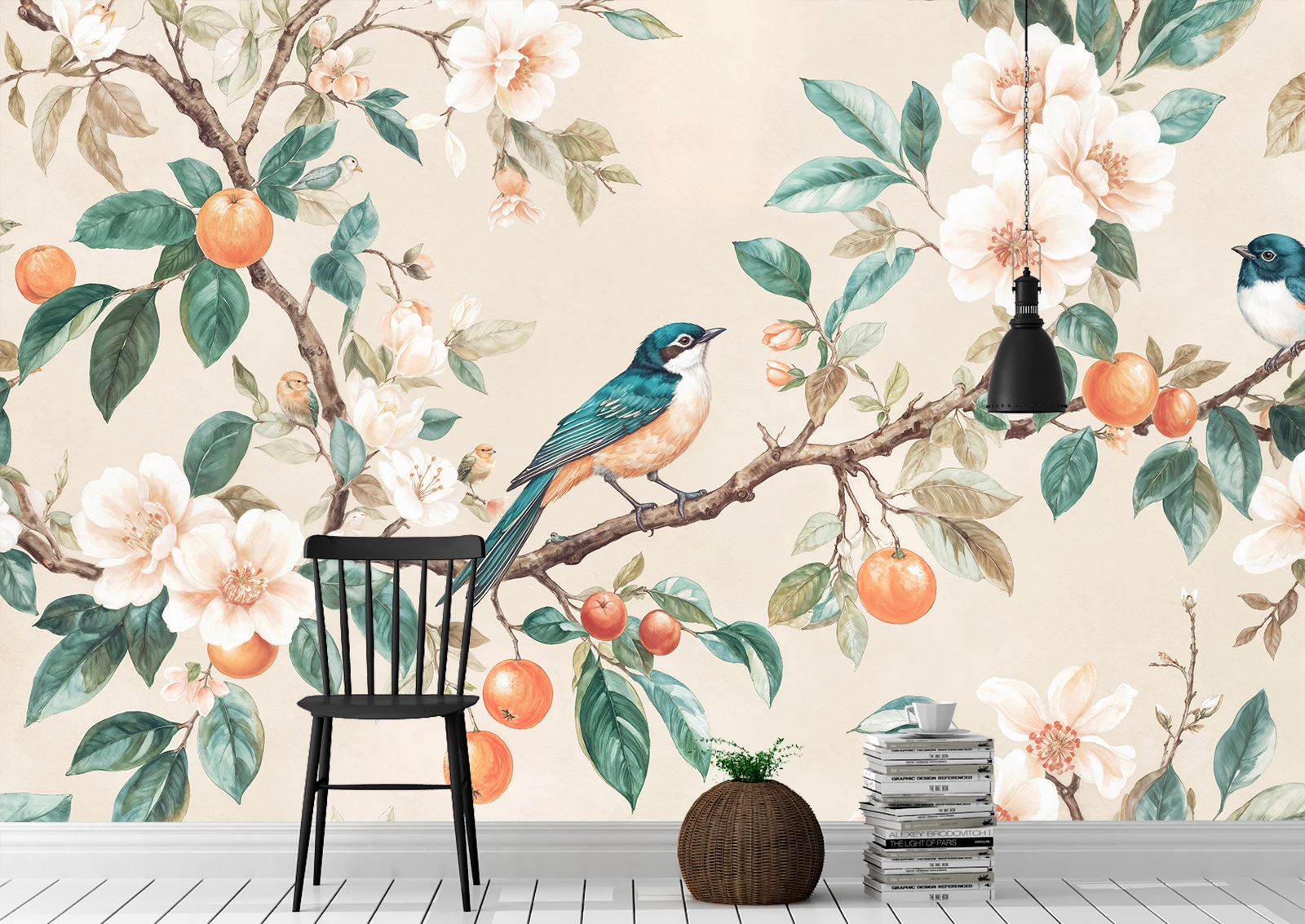 Modelul este potrivit pentru living, dormitor sau spații creative unde se dorește un accent decorativ romantic și natural. Ilustrația generoasă, cu elemente botanice și păsări delicat conturate, adaugă profunzime și dinamism încăperii, fără a aglomera vizual. Fototapetul se integrează perfect atât în decoruri moderne, cât și în stiluri clasice sau feminine, devenind un punct central plin de farmec, care transformă spațiul într-un colț de frumusețe și relaxare.