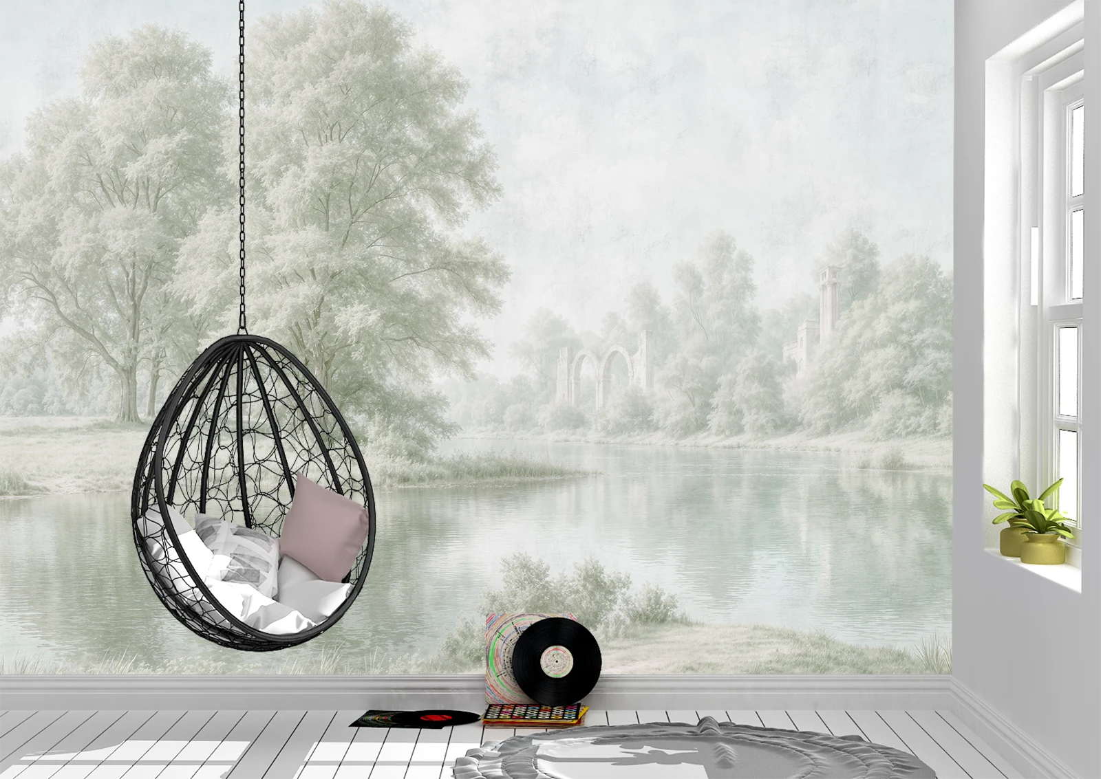 Fototapetul „Liniște la malul lacului” transformă orice cameră într-un spațiu aerisit și armonios. Peisajul în nuanțe pastelate, cu apă calmă, arbori luminoși și fragmente arhitecturale îndepărtate, creează o atmosferă de vis care invită la relaxare și contemplare. Textura fină și desenul delicat aduc o eleganță naturală, fără a domina restul decorului.