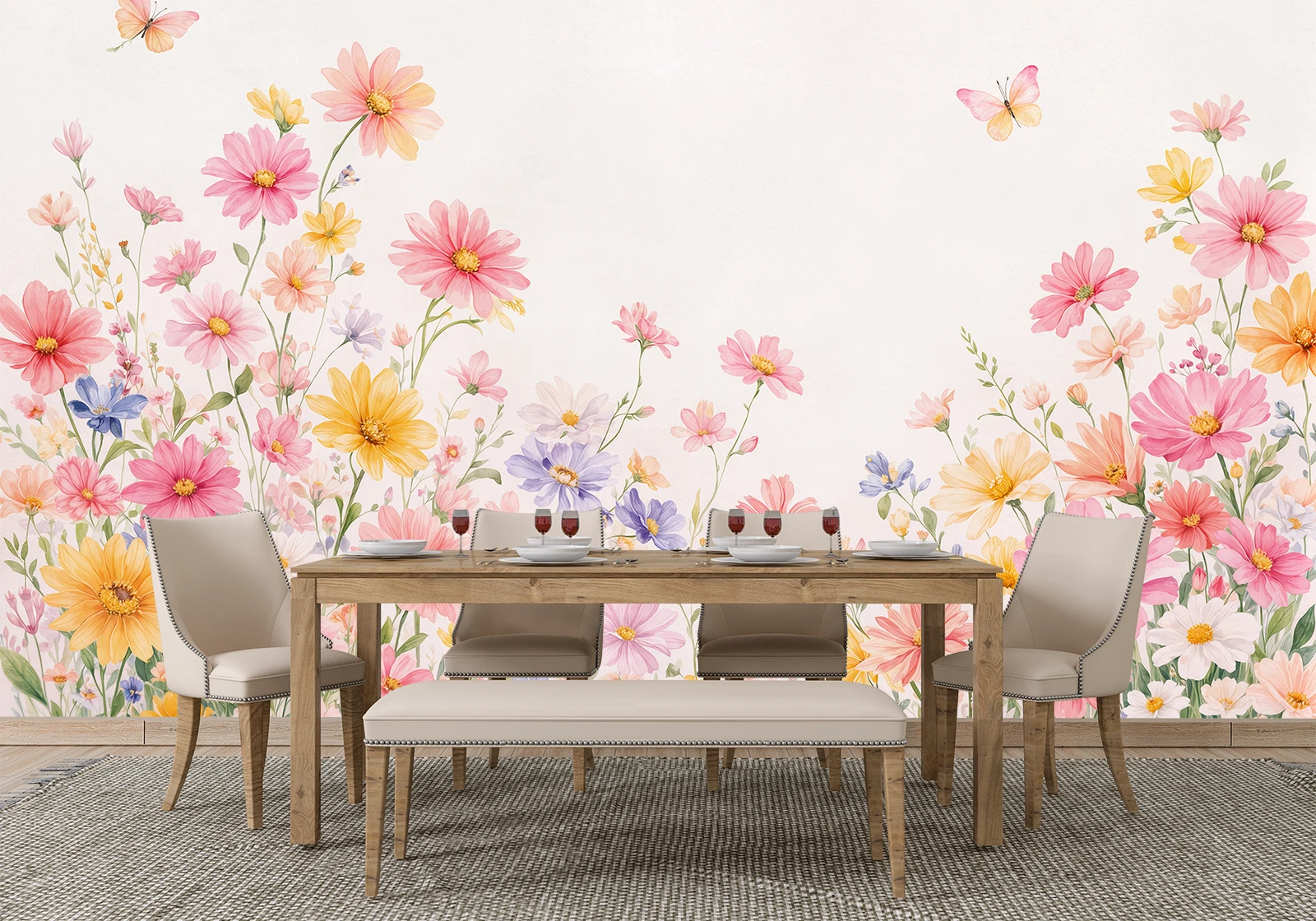 Acest fototapet floral în nuanțe pastelate aduce un plus de prospețime și delicatețe în orice interior. Florile colorate, în tonuri de roz, galben și mov, creează un decor plin de viață și armonie, transformând peretele într-un punct de atracție vizuală.
