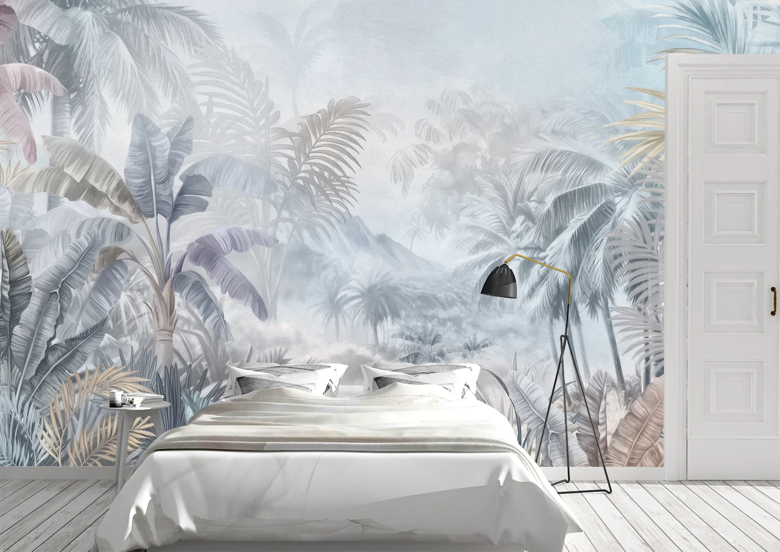 Acest fototapet tropical în nuanțe pastelate aduce o atmosferă calmă și rafinată în orice încăpere. Ilustrația cu palmieri și peisaj montan, realizată în tonuri delicate de albastru, verde și bej, creează un decor echilibrat și relaxant.