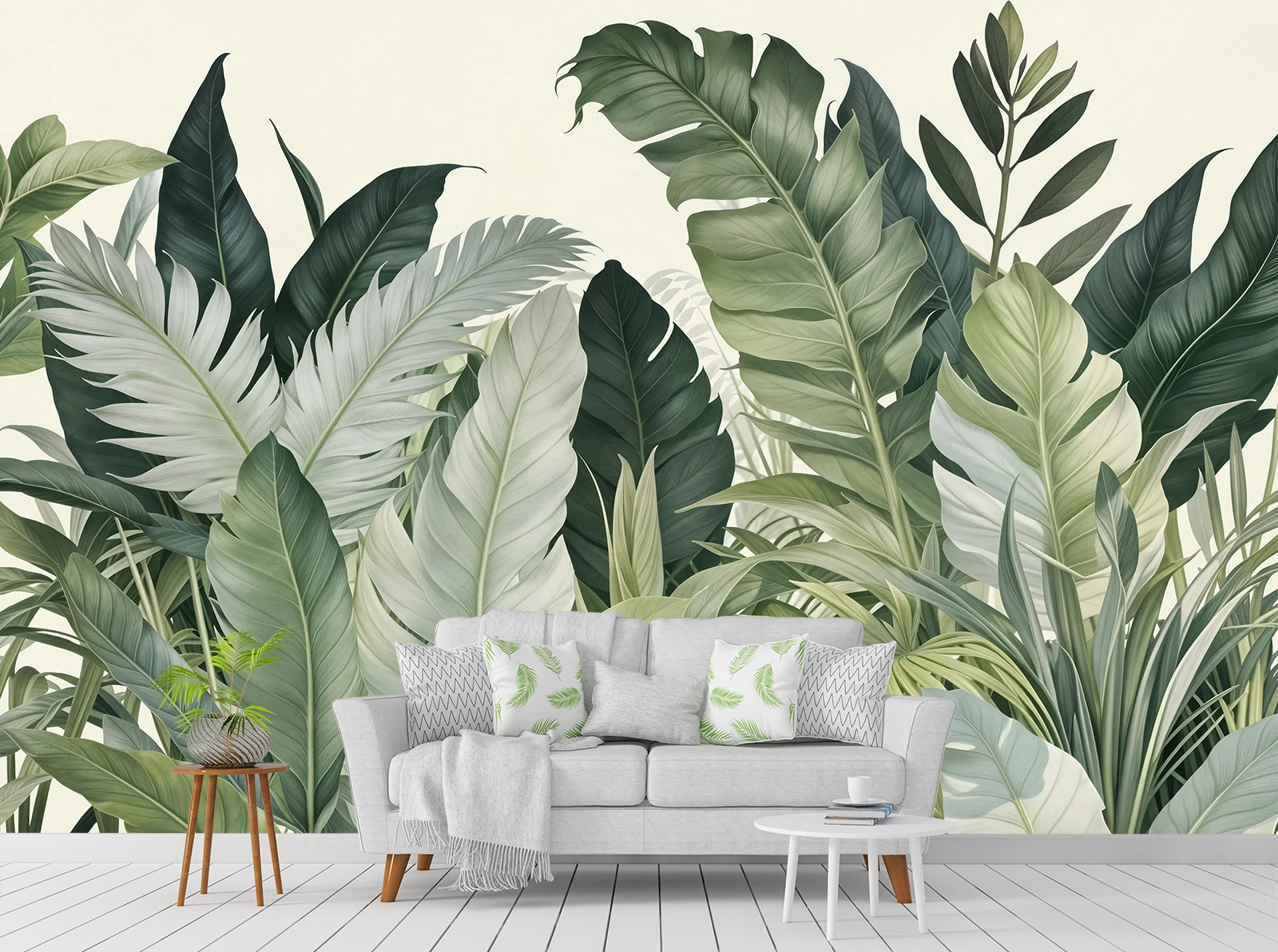 Acest fototapet cu frunze tropicale verzi aduce un aer proaspăt și natural în orice interior. Designul bogat în detalii, cu frunze mari și texturi fine, creează un decor plin de viață și echilibru vizual. Nuanțele variate de verde, combinate cu tonuri deschise de fundal, oferă o atmosferă calmă și luminoasă, ideală pentru spațiile moderne.