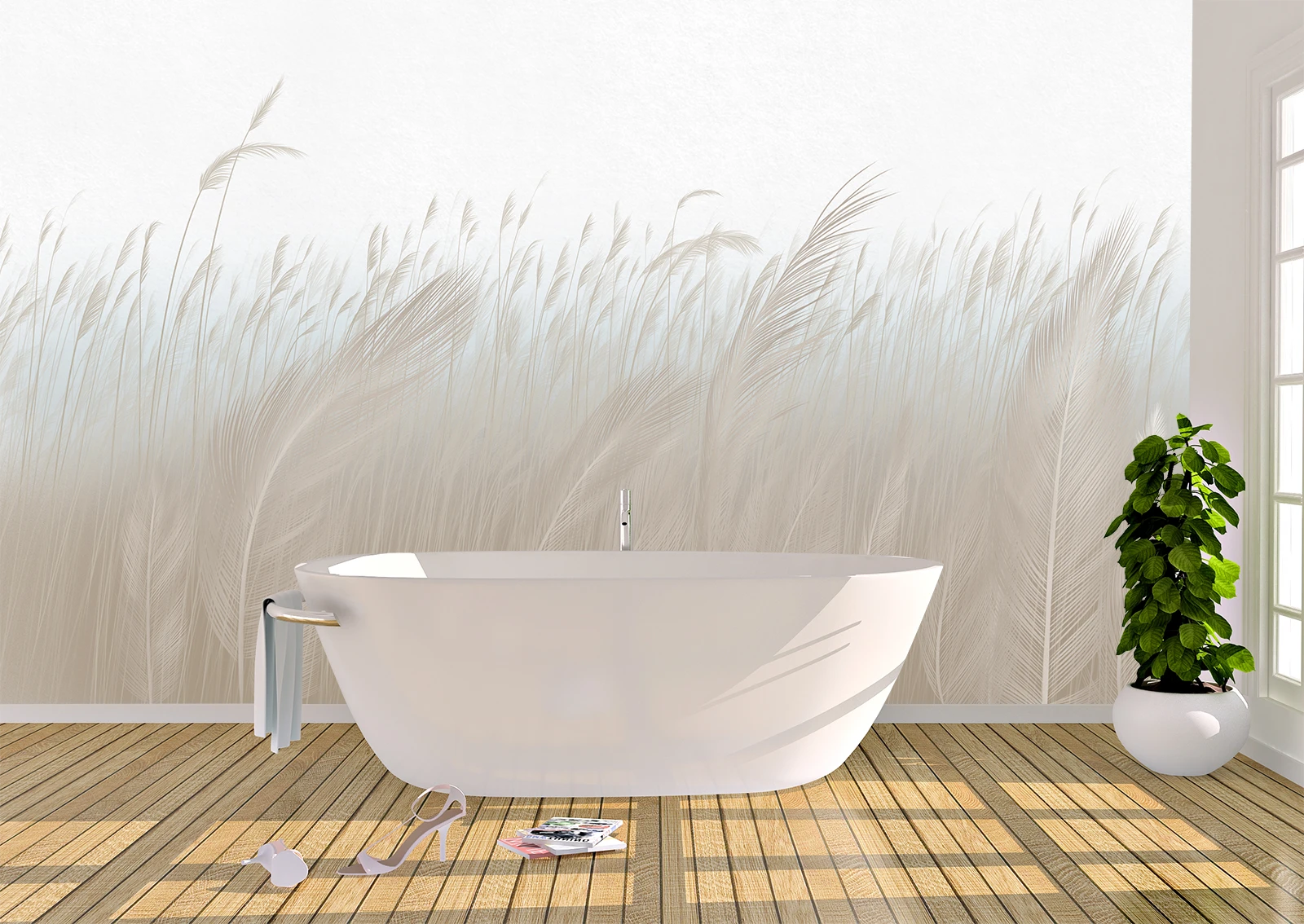 Acest fototapet natură aduce o notă de eleganță minimalistă și calm interior, prezentând o ilustrație delicată cu fire de stuf și iarbă de pampas. Designul este realizat într-o paletă cromatică suavă de bej și crem, cu un gradient fin care oferă profunzime și o senzație de spațiu deschis peretelui.