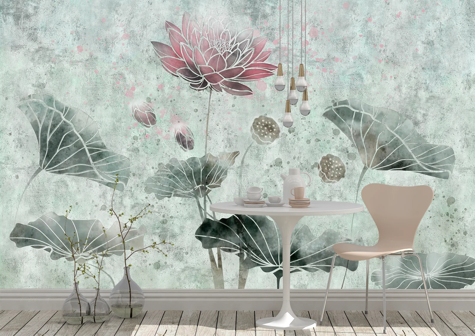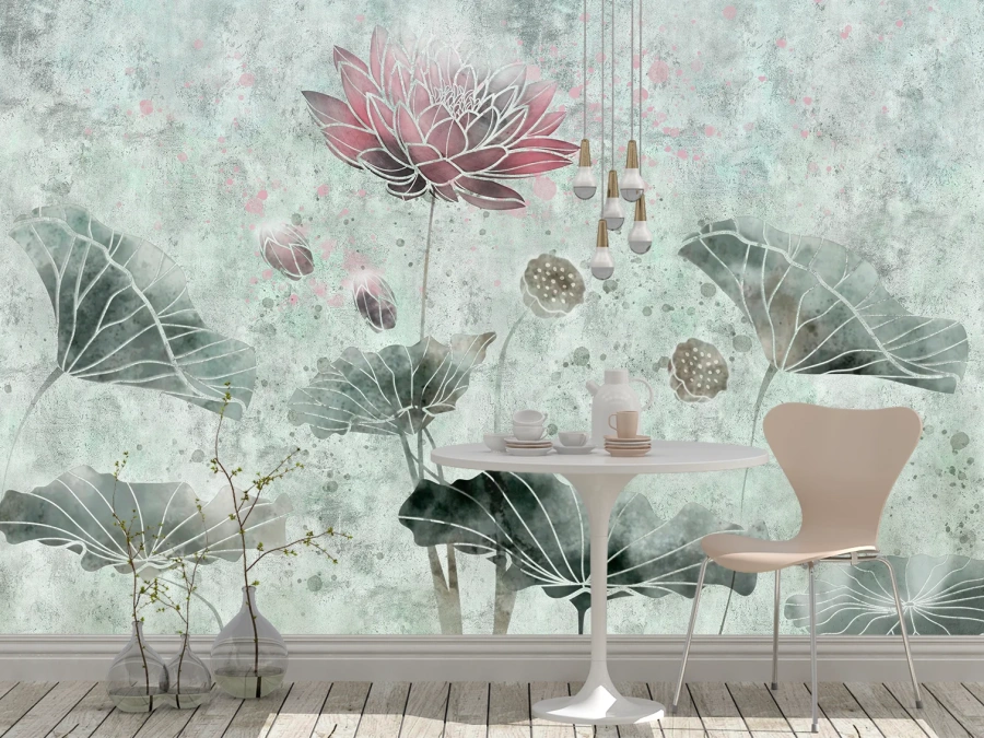 Acest fototapet cu lotus artistic aduce un aer rafinat și relaxant în orice încăpere. Compoziția delicată cu flori de lotus și frunze mari în nuanțe verzi, completată de accente subtile de roz, creează un efect vizual calm și elegant.