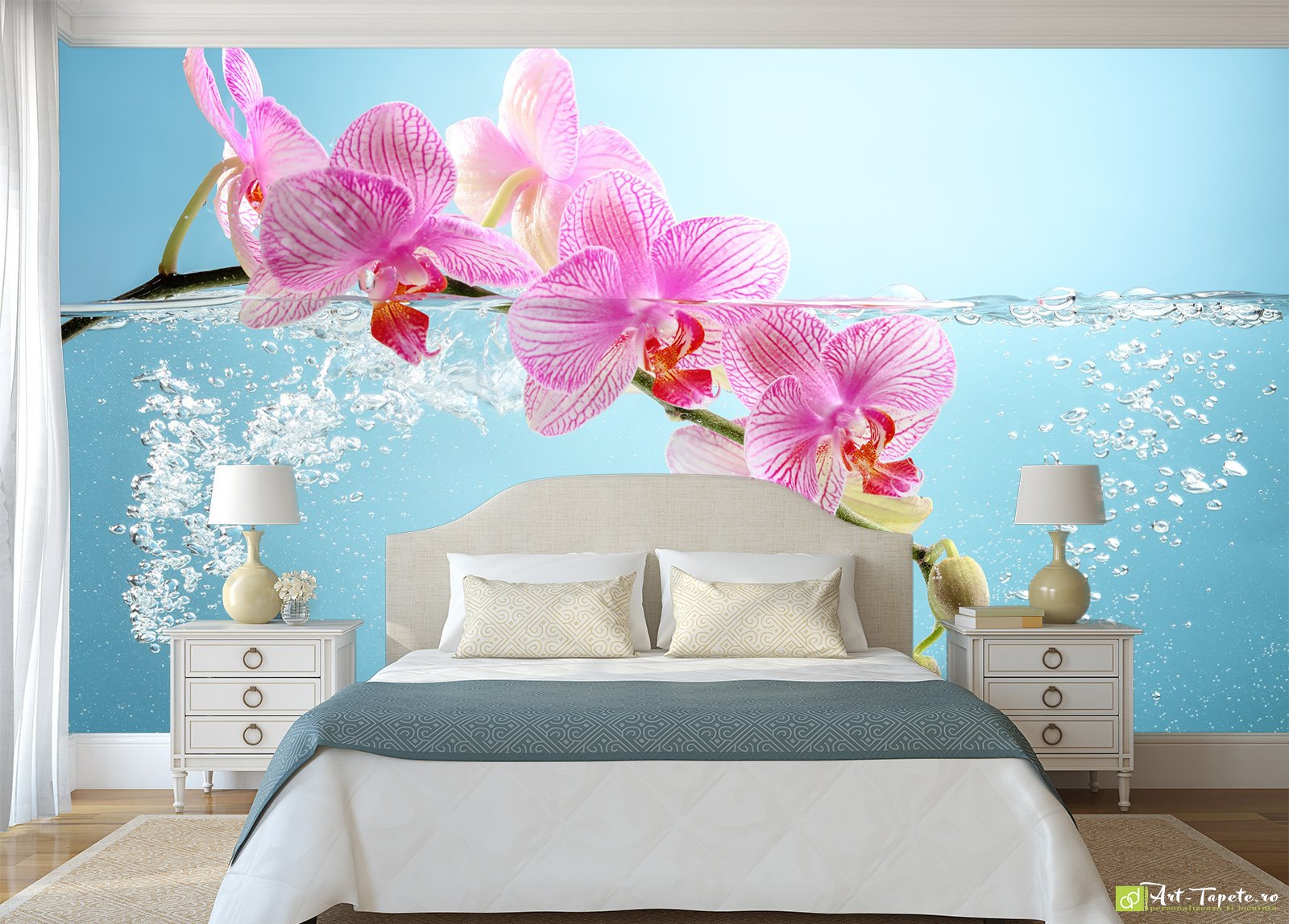 Realizat din materiale de înaltă calitate, fototapetul asigură o aplicare ușoară și o durabilitate extinsă. Imaginea detaliată a orhideelor înconjurate de apă transparentă aduce un sentiment de profunzime și dinamism, fiind ideală pentru a aduce un strop de natură și lux în orice încăpere. Fundalul acvatic accentuează delicatețea și rafinamentul florilor, oferind un contrast frumos și o atmosferă liniștitoare.